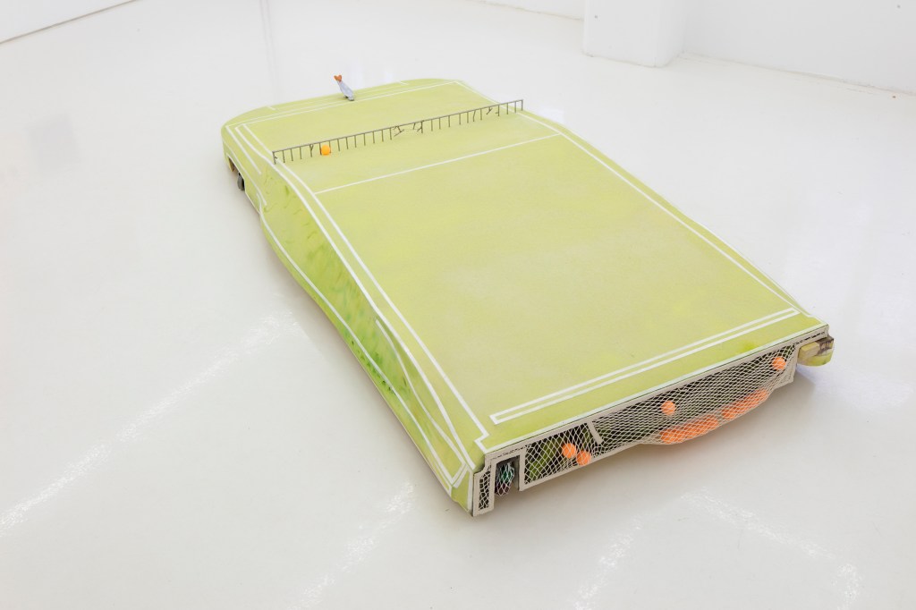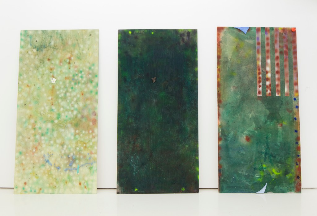 Stalkers greens : Spring flu, Green flash, Ground water (2021) Acrylic on plywood and collageNomadi (2021) Acrylic on canvas, pastel, charcoal, painted wood and bronzeCollector’s green (2021) Acrylic on canvas, aluminium, stainless steel, customized cotton nets, pingpong balls, snooker balls,