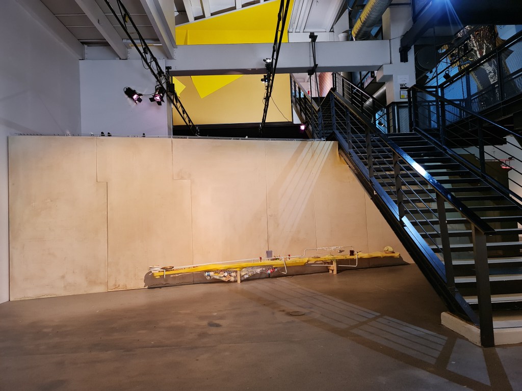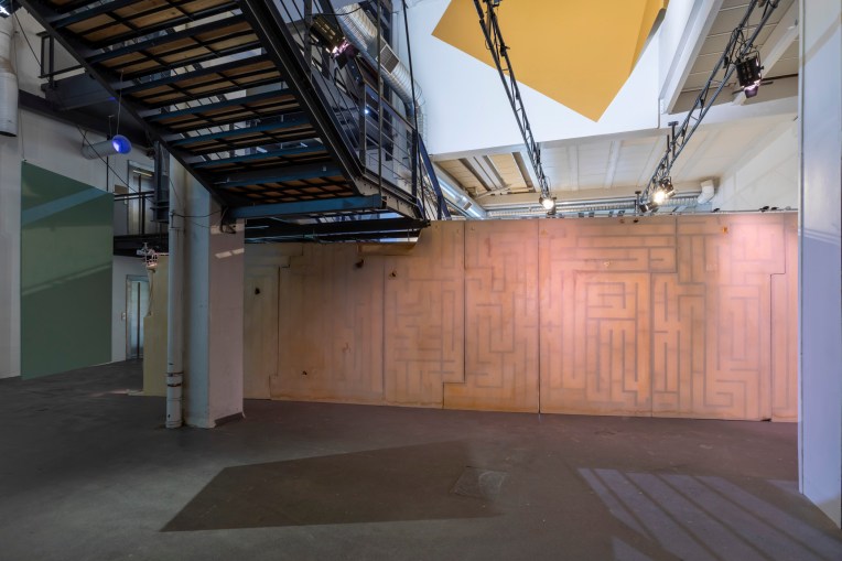 Untitled Wall, 2022, acrylic and coffee on canvas and custom wood-structure, and alumine structure with plastic sculptures on top of the wall. The wall consists of 8 ”wall”-elements. inside of the elements is 14cm thick labyrinth structure, that is continous through the wall and sees through with correct lightning conditions. Height 290 cm and length 1180 cm